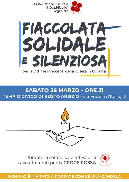 L’associazione culturale Il Quadrifoglio di Busto Arsizio organizza una “fiaccolata solidale e silenziosa per le vittime innocenti della guerra in Ucraina”, in programma sabato 26 marzo alle ore 21 presso il Tempio Civico, davanti al municipio.