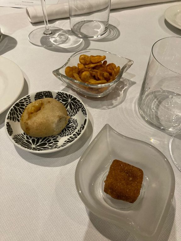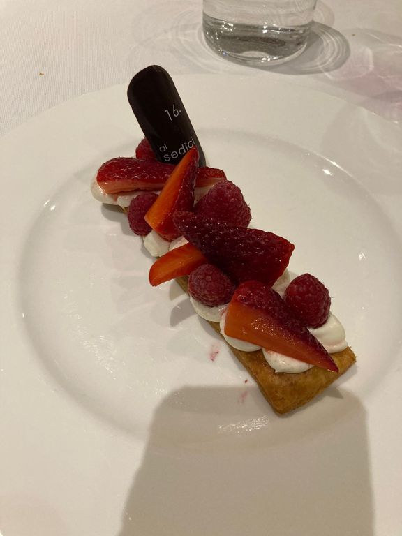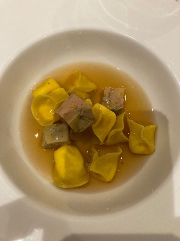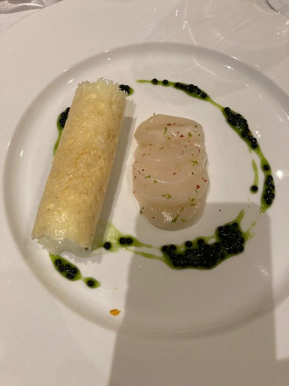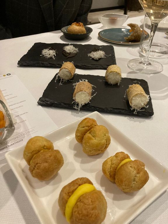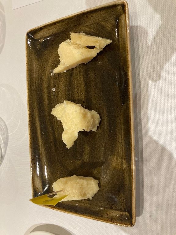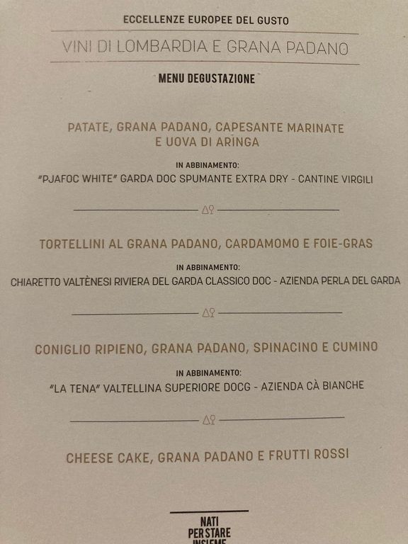 Dopo un’interessante degustazione di diverse stagionature di Grana, e quella di alcuni amuse-bouche con il Grana già protagonista indiscusso, ecco il via al menù, che ha riservato nell’ordine un antipasto di patate, Grana Padano, capesante marinate e uova di aringa, Tortellini al Grana Padano, cardamomo e foie gras, Coniglio ripieno, Grana Padano, spinacino e cumino e Cheese cake, Grana Padano e frutti rossi.