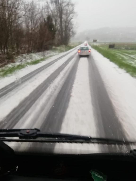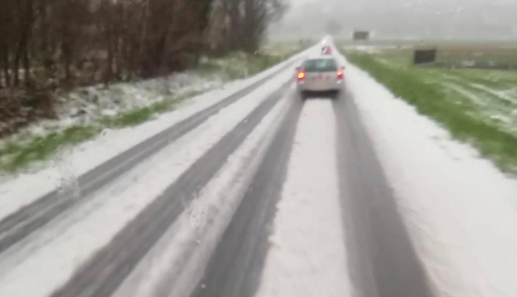 La foto postata sulla pagina Facebook di Gianluca Bertoni: l'effetto di una nevicata sulle strade dopo i temporali con grandine della serata è visibile anche sulla Pedemontana