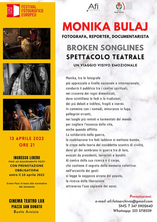 Il 13 aprile alle 21, al Cinema Teatro Lux di Busto Arsizio (piazza San Donato), lo spettacolo teatrale “Broken songlines” di Monika Bulaj. Si tratta di un vero e proprio viaggio visivo emozionale a cura della fotografa, reporter e documentarista di fama internazionale.