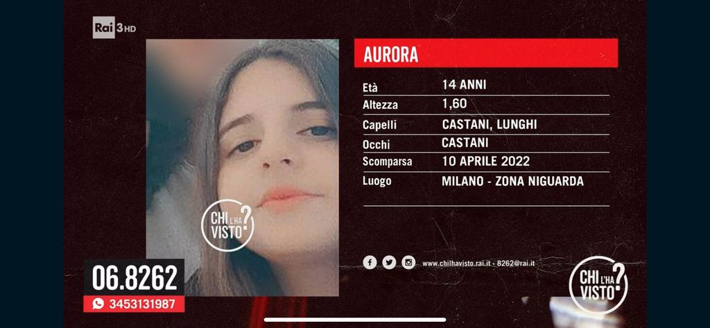 Aurora si trovava in una comunità di Milano: si sarebbe allontanata da domenica 10 aprile. L'adolescente ha appunto 14 anni, è alta 1.60, ha lunghi capelli castani e occhi di uguale colore. È scomparsa dalla zona di Niguarda, specifica la scheda diffusa dalla trasmissione. Non avrebbe con sé né i documenti, né il cellulare.