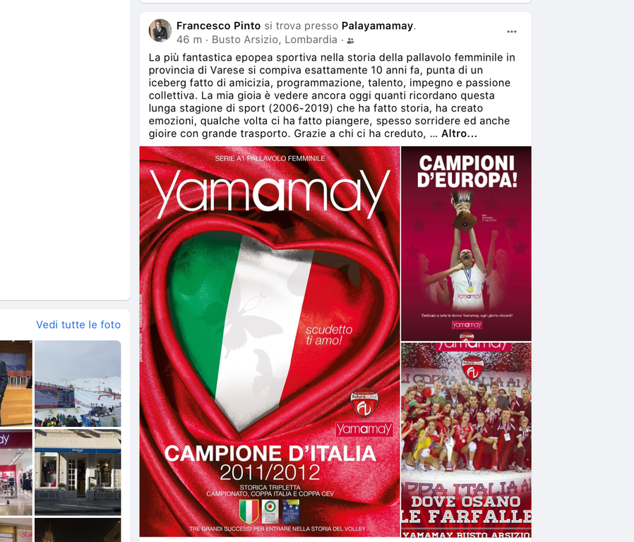 La prova del nove è che questo anniversario è ancora vivo, ribadisce Pinto. Che aggiunge: «La mia gioia è vedere ancora oggi quanti ricordano questa lunga stagione di sport (2006-2019) che ha fatto storia, ha creato emozioni, qualche volta ci ha fatto piangere, spesso sorridere ed anche gioire con grande trasporto. Grazie a chi ci ha creduto, a chi ha voluto sostenerci, a chi ci ha voluto bene. Uno scudetto... è per sempre».