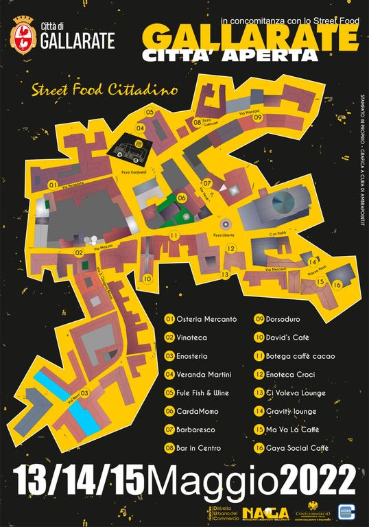 Il Distretto Urbano del Commercio di Gallarate, in concomitanza con “Urban Lake Street Food” del 13, 14 e 15 maggio, in piazza Garibaldi, ha organizzato un evento collaterale con i commercianti di Gallarate. Una quindicina le attività che partecipano all'evento con proposte ad hoc. A seguire, l’elenco delle adesioni e delle proposte (la dislocazione dei locali in fondo all’articolo).