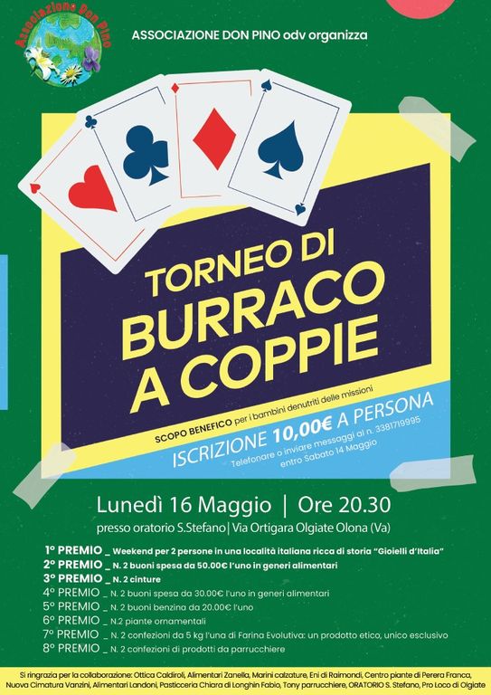 L’appuntamento è per le 20.30 di lunedì 16 maggio quando si darà il via al torneo di burraco a coppie che avrà luogo all’interno dei locali dell’oratorio Santo Stefano di via Ortigara.