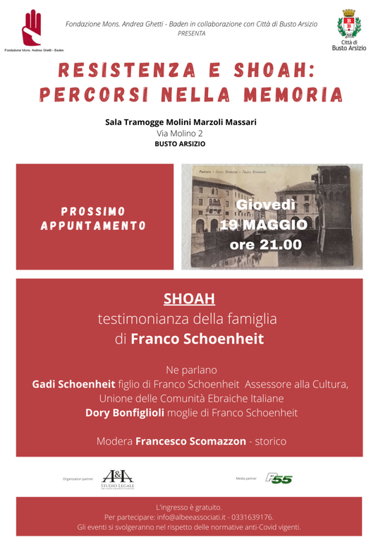 “Shoah - testimonianza della famiglia di Franco Schoenheit”: giovedì 19 maggio alle ore 21 alla Sala Tramogge di Busto Arsizio. All'incontro parteciperà il figlio Gadi con la madre Dory Bonfiglioli. Modera Francesco Scomazzon, storico e ricercatore varesino