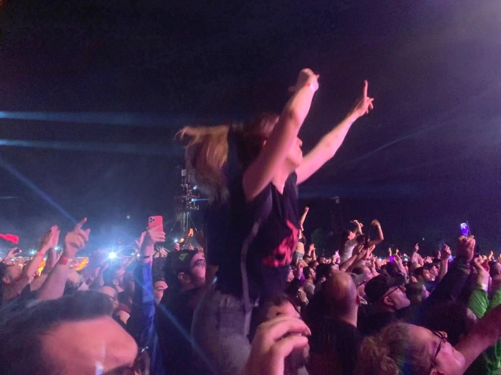 Tre anche le generazioni (forse due e mezzo ed è questo l’unico pensiero cupo di serata: noi “anta” abbiamo ripreso a respirare uno dei profumi più intensi della vita sociale, quello di un concerto…Quando lo faranno anche i giovani? Sanno e sapranno mai di cosa stiamo parlando?) assiepate l’una sull’altra, una scaletta di 28 chicche (mai abbastanza) e un cielo nero nero da cui però, una volta che il rocker di Zocca sale sul palco, non scende quasi una goccia. Pure Giove si è inchinato al ritorno del Komandante.