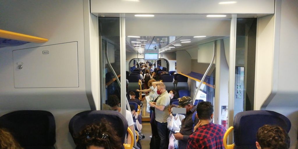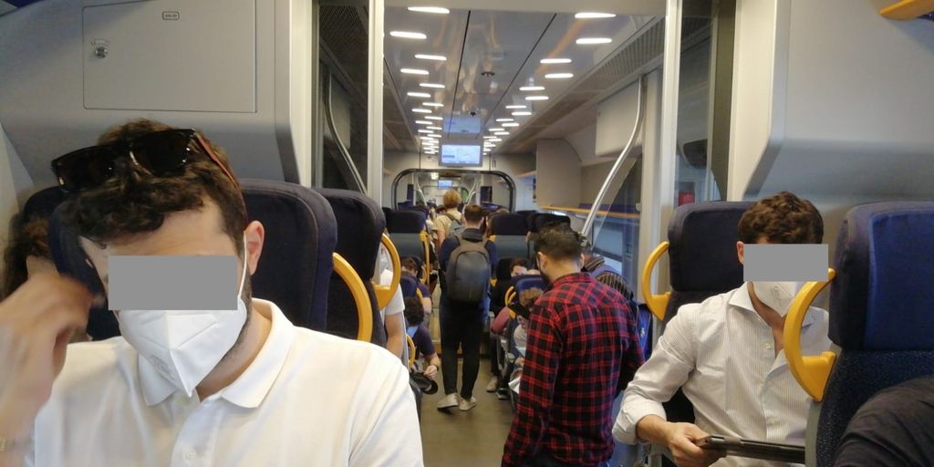 Cronache di come si riempie un treno. A Castellanza c'è ancora una situazione ragionevole sul convoglio documentato dalle fotografie, a Rescaldina si può notare la gente in piedi. A Saronno la situazione di affollamento è conclamata, anche perché fino a Bovisa non ci sono fermate intermedie.