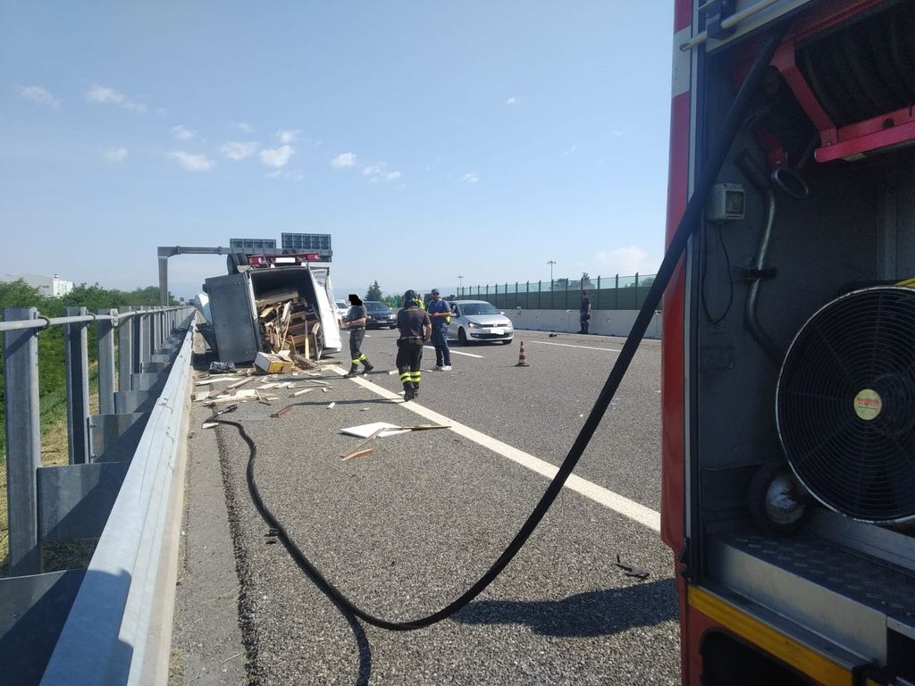 L'incidente questa mattina alle 9.30. Coinvolte due auto, un mezzo pesante e un furgone che si è ribaltato disperdendo il carico in strada
