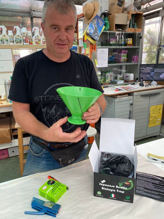 Passiamo alla terribile Popillia Japonica, che sta attaccando e devastando piante di vite, rose, prugni e ciliegi. «Rappresentano il suo "menu" preferito... anche se poi va a finire che mangia anche tutto il resto. Noi consigliamo le trappole a base di feromone, che attirano la popillia e poi la catturano, ma occorre prestare un'attenzione fondamentale. La trappola non deve essere posizionata sotto la pianta, ma un po' distante da ciò che va protetto, ai margini di orto, bosco o giardino, anche a 20 metri: se è troppo vicina agli insetti che si vogliono debellare, ne attirerà molti altri in più anche dalle piante o dagli orti vicini. La popillia infatti vola, e vola lontano. Ed è una bestia difficile da sconfiggere».