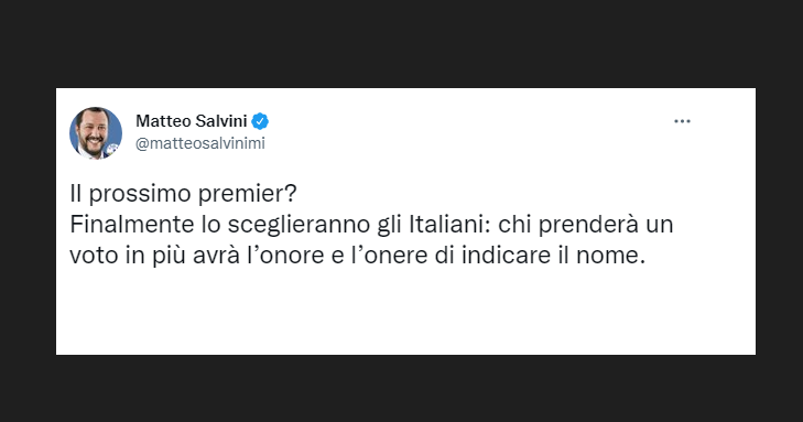 Con un tweet all’ora di cena, il leader leghista ha indicato la linea: «Il prossimo premier? Finalmente lo sceglieranno gli Italiani: chi prenderà un voto in più avrà l’onore e l’onere di indicare il nome».