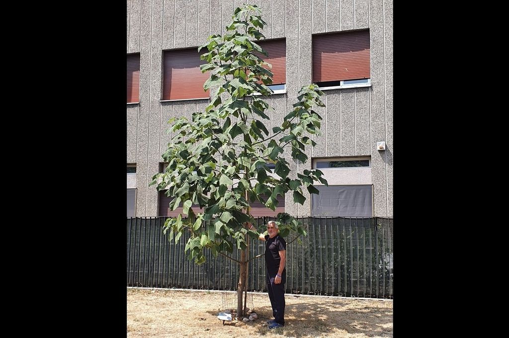 Tallarida con la paulownia piantata davanti al municipio di Busto. Sotto, l'Apecar del consigliere comunale
