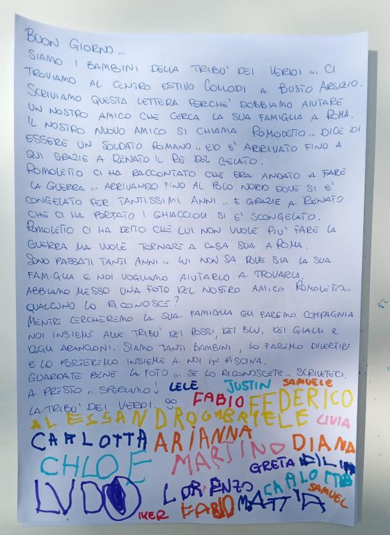 “Romoletto - racconta la coordinatrice Enza Schillaci - è spuntato in mezzo ai ghiaccioli portati da Renato il Re del Gelato venerdì 7 luglio. Erano i tempi dell’impero quando, Romoletto, in ricognizione oltre il Vallo Adriano, si inoltrava fin quasi al Polo Nord e lì rimaneva ghiacciato. Con l’innalzamento delle temperature, il pezzo di ghiaccio in cui è rimasto bloccato ha iniziato a vagare tra continenti finché si è ritrovato ghiacciolo tra i ghiaccioli. Ospite dei bambini del Collodi, che, con il loro calore, hanno restituito Romoletto al presente, il soldato ha imparato come è andato avanti il mondo e insegnato cose antiche. Ha continuato a ripetere “a guera non la vojo più fa!”, perché vuole seguire la sua vocazione vera che non è “a guera”, bensì la poesia, e ha chiesto di poter trovare qualche lontanissimo discendente che vive a Roma, sua città natia. I bambini hanno suggerito di contattare il Sindaco e gli hanno spedito una lettera per chiedere una mano…”.