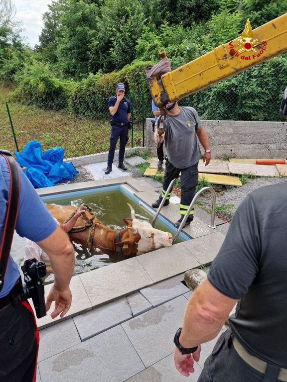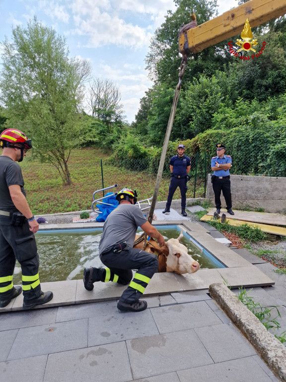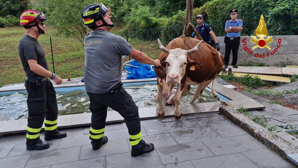 VIDEO E FOTO. Mucca scivola nella piscina di un'abitazione a Porto Valtravaglia. Salvata dai vigili del fuoco
