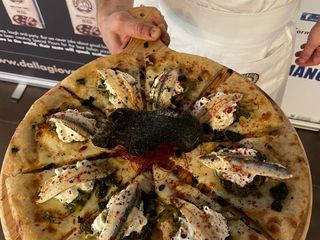 La pizza con la quale ha vinto? Con una base di mozzarella, e in uscita un nido di friarielli, stracciatella, alici marinate piccanti, pane sbriciolato al nero di seppia fatto con acqua di mare, pepe al limone, pomodoro essiccato e un filo d’olio.