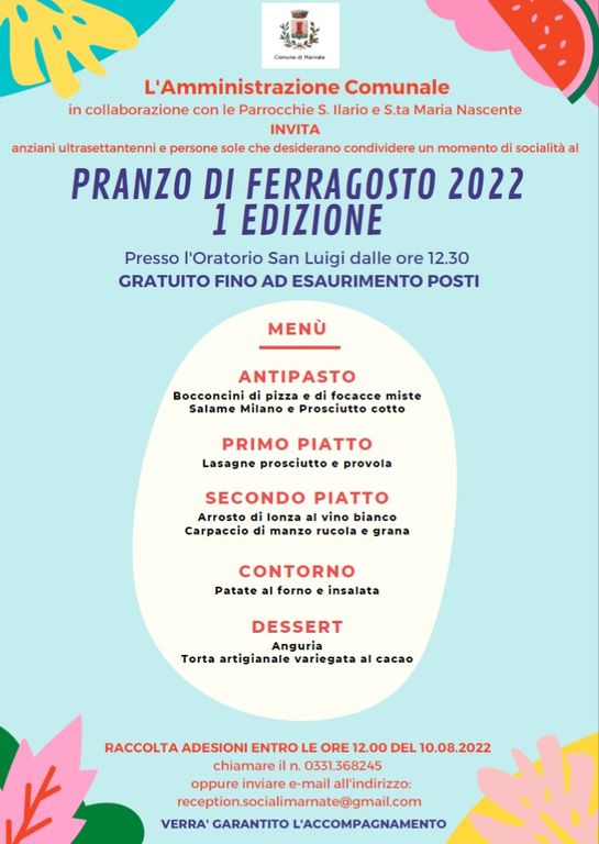 Chi desidera partecipare al pranzo, totalmente gratuito, dovrà comunicare la propria adesione entro le 12 di mercoledì 10 agosto al numero 0331.368245 o all’indirizzo reception.socialimarnate@gmail.com, comunicando anche l’eventuale presenza di un accompagnatore.