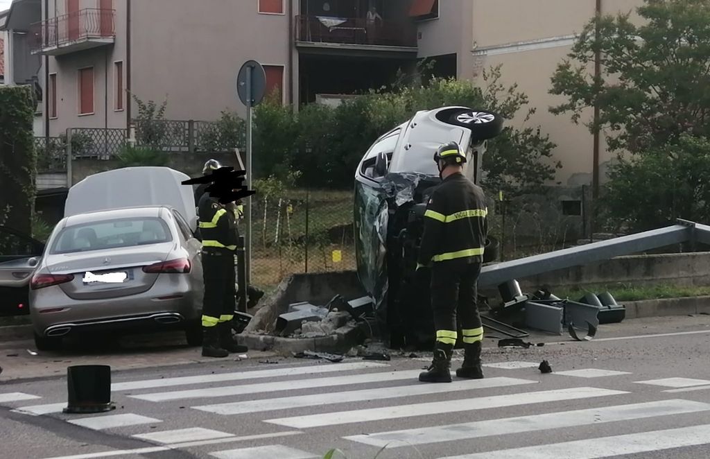 Auto si ribalta dopo un frontale e abbatte un semaforo: paura sulla Saronno-Monza