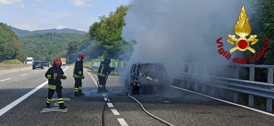 FOTO. Auto a fuoco sull'A26: gli occupanti del veicolo si mettono in salvo