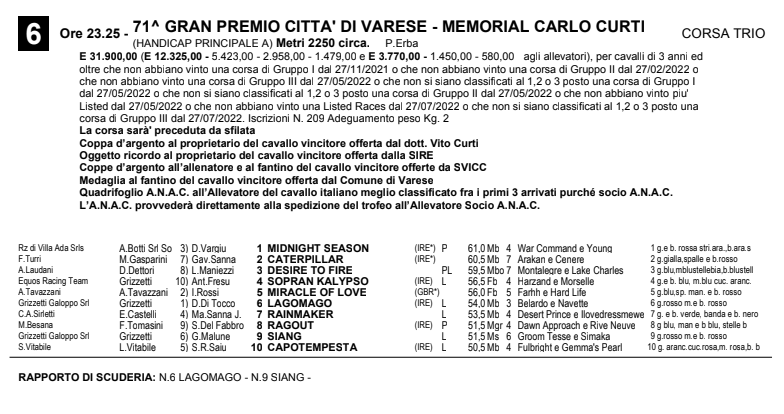 Il campione in carica ha preceduto nella Coppa del Mare un certo Midnight Season, la carta di Alduino Botti, soggetto duttile e di una certa classe, alla prima sul tracciato varesino ma avvantaggiato dalla situazione ponderale rispetto al suo antagonista.