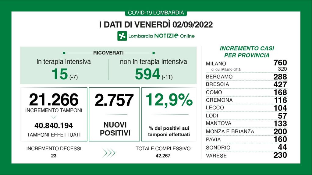 In Lombardia i positivi registrati oggi sono 2.757 a fronte di 21.266 tamponi effettuati. Il tasso di positività, ovvero il rapporto tra positivi e test, oggi è al 12,9% (ieri era 13,1%). Ieri, invece, sul nostro territorio regionale l'incremento era stato di 2.972 casi con 22.609 tamponi totali.