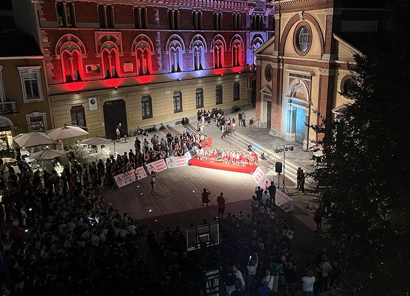 A dare l'esempio sono stati poi i Knights del MiniBasket con una serie di partite, brevi ma combattute. Tutto questo fino alle 21, quando si sono accesi i riflettori e le luci bianche e rosse hanno illuminato la facciata del Comune e della Basilica tra gli applausi calorosi di oltre 1.500 persone.