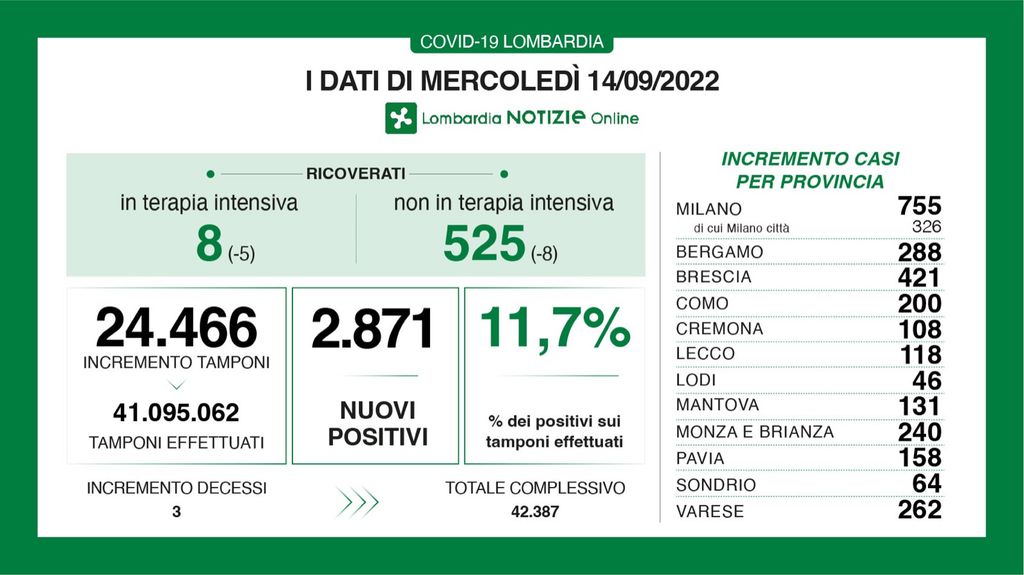 In Lombardia i positivi registrati oggi sono 2.871 a fronte di 24.466 tamponi effettuati. Ieri, invece, sul nostro territorio regionale l'incremento era stato di 4.364 casi con 37.054 tamponi totali.