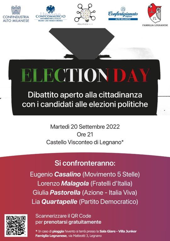 I ragazzi, di età compresa tra i 18 e i 23 anni, intendono superare il successo raccolto nei precedenti dibattiti organizzati in occasione delle elezioni amministrative, e martedì 20 settembre alle ore 21 porteranno sul palco del Castello Visconteo di Legnano quattro candidati di spicco per il collegio elettorale della città: Eugenio Casalino (Movimento 5 Stelle), Lorenzo Malagola (Fratelli d’Italia), Giulia Pastorella (Azione – Italia Viva), Lia Quartapelle (Partito Democratico).