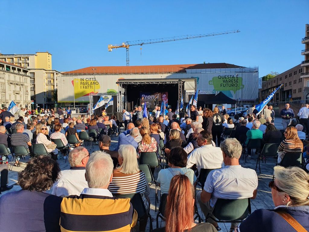 Sul palco i candidati alle elezioni del 25 settembre. Nelle prime file esponenti di spicco del partito come Mario Mantovani e gli amministratori del territorio: tra gli altri, Luigi Zocchi, capogruppo consiliare a Varese, il presidente del Consiglio comunale di Gallarate Giuseppe De Bernardi Martignoni, il consigliere provinciale Marco Colombo e il sindaco di Busto Arsizio e presidente della Provincia Emanuele Antonelli: «C’è più gente qui a Varese che a Pontida», ha scherzato quest’ultimo, scagliandosi poi contro «gli incapaci che in queste settimane attaccano noi e Giorgia Meloni con insulti».