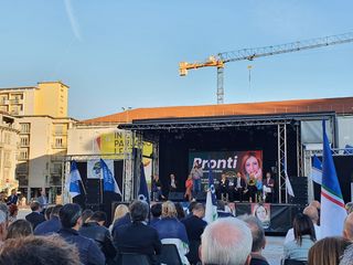 «Pronti a risollevare l’Italia» è lo slogan che campeggiava in piazza Repubblica. Accanto, il volto della leader Giorgia Meloni.