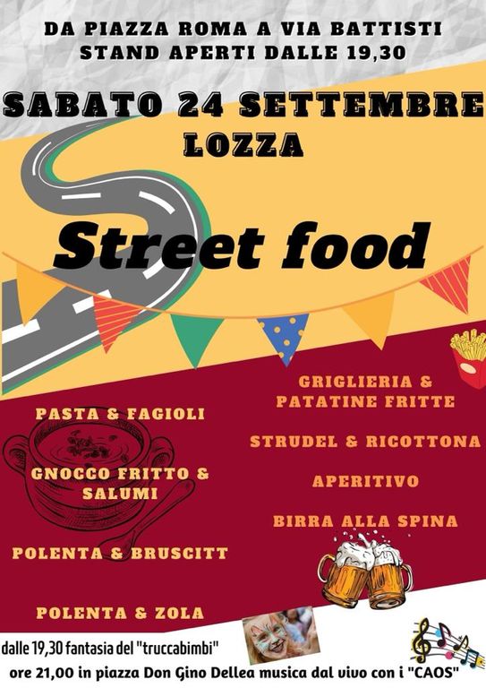 La serata di sabato 24 sarà all’insegna della musica e dello street food con la «Serata 4321: 4pass, 3bucuni, 2bicer e 1buonamusica»: un percorso di stand gastronomici da piazza Monte Grappa fino al parco del Fanciullino, dove "i CAOS" riempiranno l’aria serale con la loro musica live.
