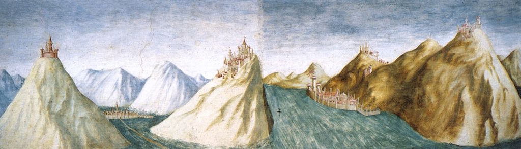 Rifondata nel 1421-1422 e ultimata verso il 1443, ma con riprese e modifiche fino al 1513, Castiglione è la grande operazione culturale, urbanistico-architettonica e figurativa voluta dal cardinal Branda Castiglioni. Il nucleo inferiore è epicentrato sul palazzo del cardinale, il palazzo dei familiari, il palazzo dei Poveri di Cristo, la Scuola (una delle prime d’età moderna) e, soprattutto, la chiesa del Corpo di Cristo, detta chiesa di Villa. Il nucleo superiore, antica rocca, comprende la Collegiata dei Santi Stefano e Lorenzo e il Battistero (in origine, cappella palatina). La volontà del cardinale di realizzare un microcosmo europeo, basato sull’interazione di artisti lombardi, veneti, toscani, francesi, tedeschi, boemi, ungheresi porta a geniali accostamenti di stili fra tardogotico e umanesimo, alle chiese che uniscono con abilità i linguaggi architettonici, ai grandi cicli di affreschi, dovuti a Masolino da Panicale, Paolo Schiavo, il Vecchietta: la Veduta ideale e il ciclo della cappella di San Martino in Palazzo Branda; le Storie della Vergine e dei Santi Stefano e Lorenzo nella Collegiata; le Storie di San Giovanni Battista nel Battistero, con un forte messaggio antivisconteo.
