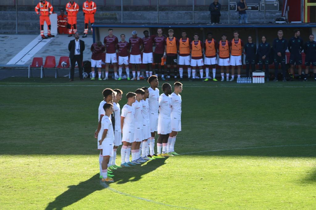 Aperto e divertente il primo tempo. L'Italia di mister Nunziata palleggia bene e spinge sulle fasce, ma sono gli elvetici a essere più pericolosi e concreti, tanto che è il portiere Sassi, del Giugliano, a mettersi in mostra con tre parate. Il gol capita su uno dei tanti capovolgimenti di fronte ed è di casa: al 36' ottimo scambio al limite dell'area tra Terracciano (Hellas Verona) e Montevago (Sampdoria), con questo ultimo che infila un potente destro sotto la traversa sul primo palo.
