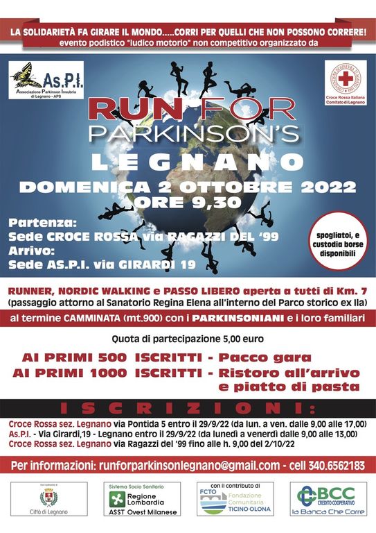 Domenica 2 ottobre (ore 9.30 con partenza dalla sede Cri di via Ragazzi del 99) si correrà l’undicesima edizione nella città del Guerriero. «Vi aspettiamo numerosi – proseguono – per “correre per chi non può più correre”. Un ringraziamento al Comune di Legnano per il patrocinio concesso, all’Asst Ovest Milanese, alla Fondazione Comunitaria Ticino Olona e alla BCC Credito Cooperativo per il loro contributo. Grazie ai nostri “sponsor storici” che anche quest’anno ci hanno dato la possibilità di far ri-partire la Run for Parkinson’s. E grazie anticipatamente a chi vorrà raccogliere il nostro appello».