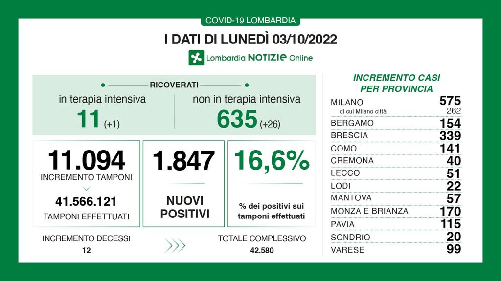 In Lombardia i positivi registrati oggi sono 1.847 a fronte di 11.094 tamponi effettuati. Ieri, invece, sul nostro territorio regionale l'incremento era stato di 4.896 casi con 25.694 tamponi totali.
