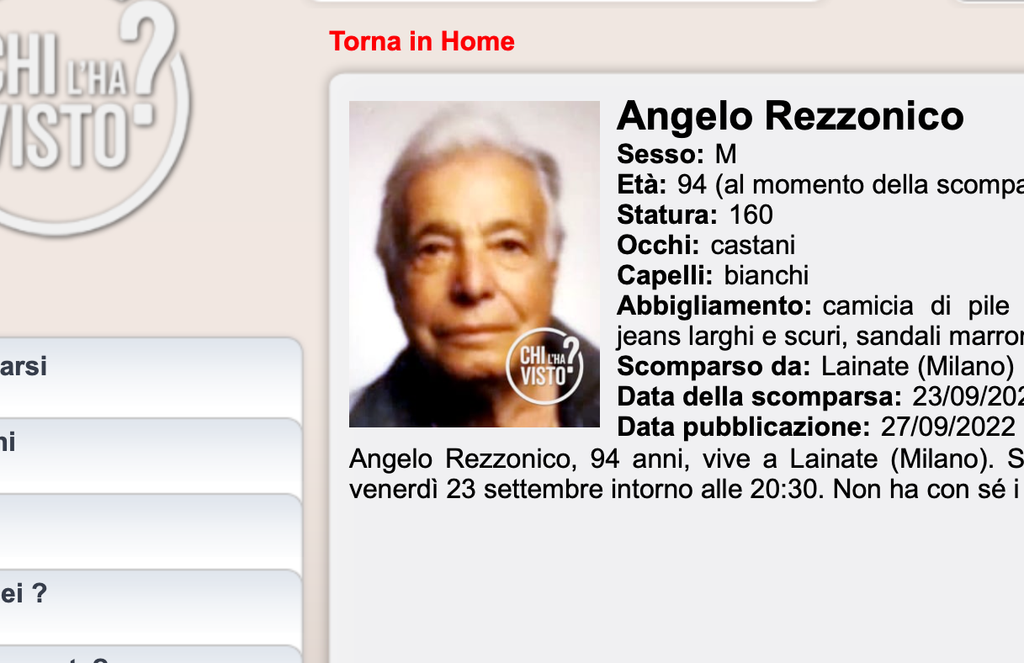 Ricerche febbrili per Angelo Rezzonico scomparso ormai da 11 giorni. Era uscito a fare una passeggiata dalla sua abitazione a Lainate. Le forze dell'ordine lo stanno cercando nella zona e sono in azione in queste ore gli elicotteri.