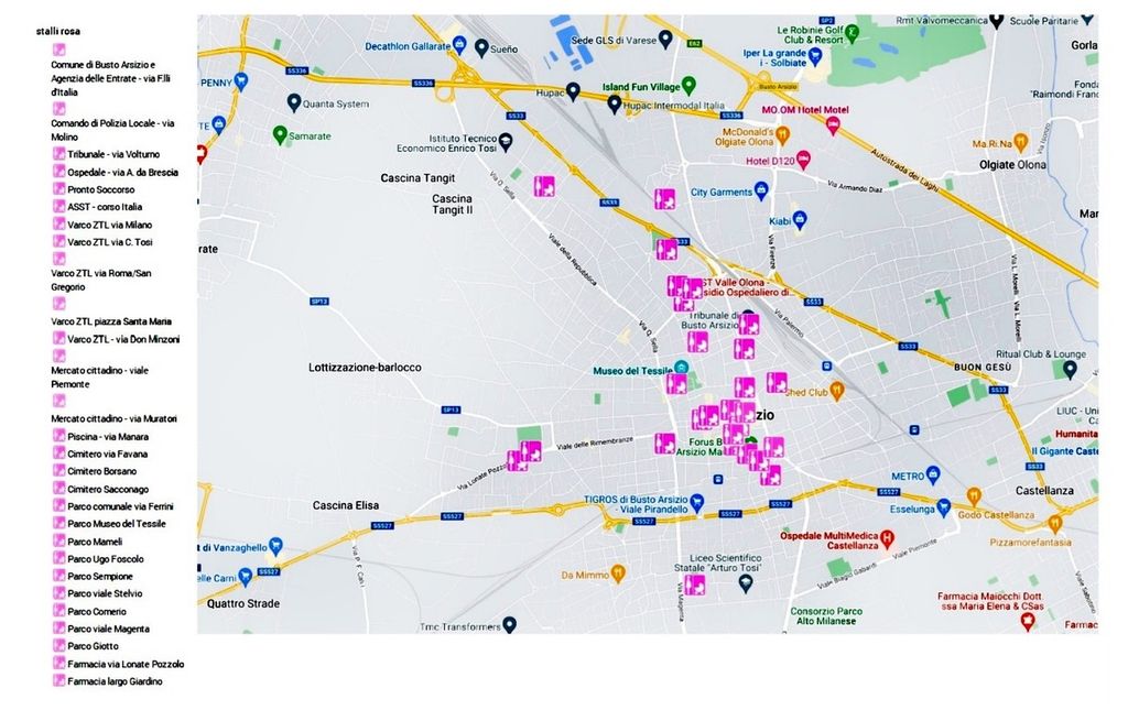 Queste le vie dove verranno collocati i parcheggi rosa: Via F.lli d'Italia 12 2. Via Molino 2 3. Via Volturno 8 4. Via A. da Brescia 12 5. Via A. da Brescia 14 6. P-le Solaro 1 7. P.zza Garibaldi 1 8. Via Mazzini 8 9. P.zza Trento e Trieste 1 10. Via Bramante 4 11. Via Rosmini 4 12. Viale Piemonte 5 13. Congiungente Via Gaeta a Via Muratori (ingresso pedonale area mercato cittadino) 14. Via Manara 13 (ingresso piscina) 15. Via Favana – (fronte ingresso Cimitero) 16. Via Villa Cortese – (area di sosta lato sud) 17. Via Bienate – (area di sosta antistante ingresso Cimitero) 18. Via Ferrer fr.5 (ingresso parco comunale 19. Via Galvani fr. 15 (ingresso parco) 20. Via Mameli – fr. 18 (ingresso parco) 21. Via U. Foscolo 4 22. Via Sempione (ingresso parco del Sempione 23. Viale Stelvio 1 24. Via Espinasse 3 25. Via Madonna del Monte – ingresso parco Viabilandia 26. Via Giotto 7 27. Via Lonate Pozzolo area di sosta fr. 33 28. Via G.B. Pergolesi 1 (ant. farmacia) 29. Via Cavallotti 4 30. Piazza XXV Aprile 7 (fr. Farmacia).