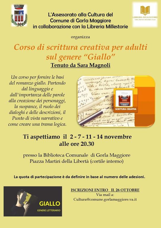 Se qualcuno avesse mai pensato di ingegnarsi autore di gialli, a Gorla Maggiore si può. Nella prima metà di novembre, in quattro serate, il 2 – 7 – 11 e 14 in biblioteca si tiene un corso di scrittura creativa per adulti sul genere “Giallo”. Così la struttura di piazza Martiri della Libertà si anima di promessi scrittori. A insegnare i trucchi per scrivere bene questo genere alquanto singolare, la scrittrice e giornalista Sara Magnoli.
