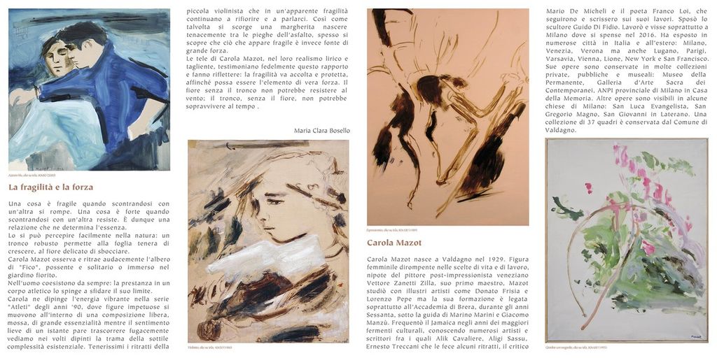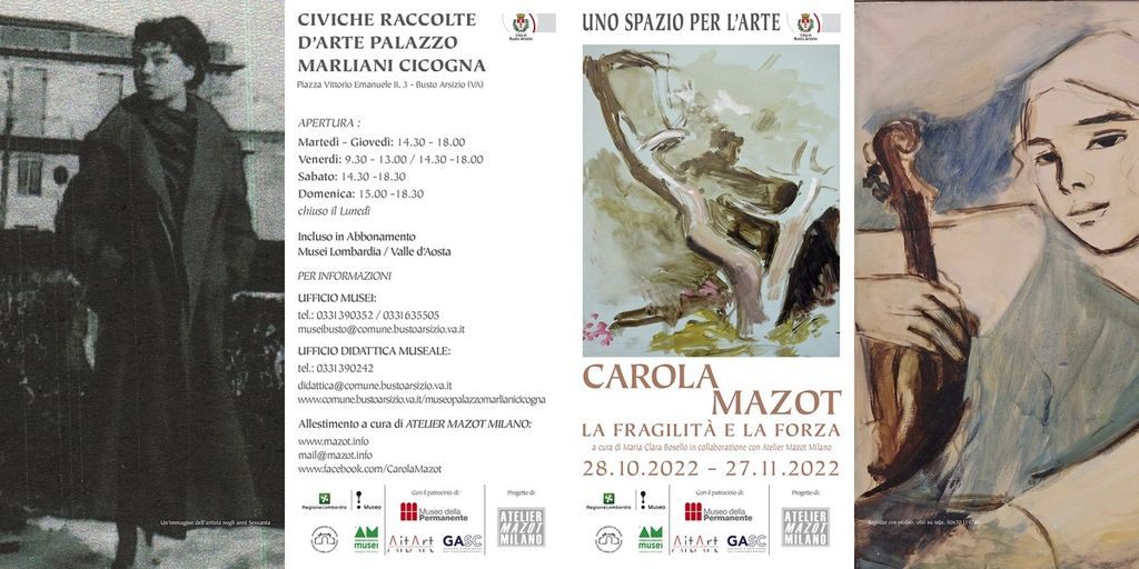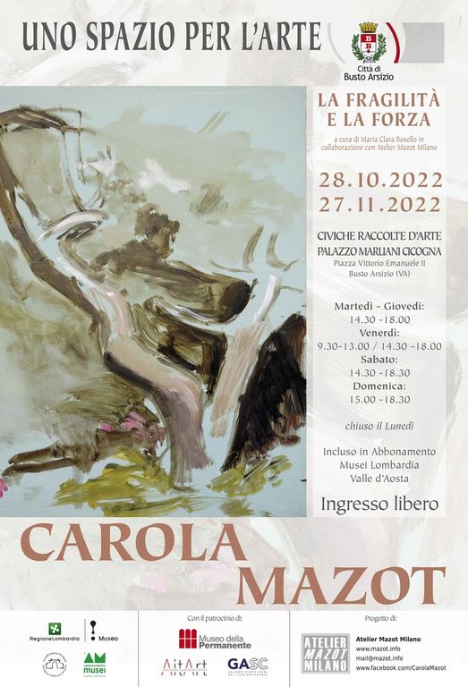 Nell’ambito della rassegna Uno spazio per l’arte, sarà inaugurata il 28 ottobre alle ore 18.00 negli spazi di Palazzo Marliani Cicogna la retrospettiva dal titolo “Fragilità e forza”, che la città di Busto Arsizio dedica a Carola Mazot (Valdagno 1929 – Milano 2016) artista veneta vissuta a Milano e formatasi all’Accademia di Brera negli anni ‘60 sotto la guida di Marino Marini e Giacomo Manzù.