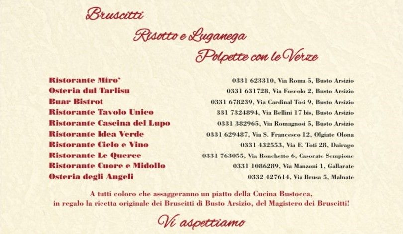Promossa dal Magistero dei Bruscitti, con il patrocinio del Comune di Busto Arsizio, arriva la Settimana della cucina Bustocca. Dieci ristoranti, di cui 5 fuori Busto.