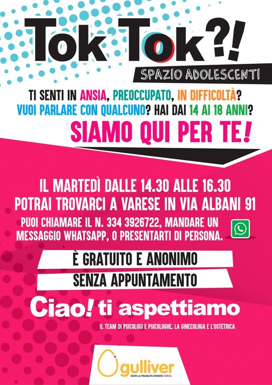 Dal 4 ottobre è attivo Tok Tok, lo sportello di ascolto per gli adolescenti e le adolescenti dai 14 ai 18 anni. Gratuito e anonimo. Ogni martedì, dalle 14:30 alle 16:30 gli psicologi del Gulliver, l’ostetrica e la ginecologa sono a totale disposizione per ascoltare le loro storie, i loro dubbi e domande, con professionalità ed empatia. “Tok Tok è nato – sottolinea la dott.ssa Valsecchi – da un’ulteriore esigenza emersa dal territorio varesino. Quella di creare un luogo e un tempo di ascolto, dove gli adolescenti possano incontrare una figura di adulto esperto. Obiettivo? Confrontarsi sui dubbi della loro età, incertezze, curiosità, o fare domande nell’ambito delle relazioni familiari, socio-amicali e scolastiche, dei loro processi di crescita emotiva, fisica, cognitiva e della percezione di sé. Tutto questo in spazio senza giudizio e in modo anonimo”. Un prezioso servizio di prevenzione primaria al disagio e alla sofferenza. Basta chiamare il numero 334 3926722 o mandare un messaggio WhatsApp.