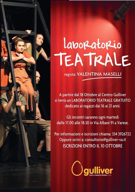 Il secondo progetto di prevenzione rivolto agli adolescenti dai 16 ai 21 anni è un laboratorio di teatro, partito il 18 di ottobre con la presenza di un’operatrice psicologa del Gulliver e di Valentina Maselli, regista professionista. “Questo laboratorio è completamente gratuito. Utilizziamo, infatti, parte dei fondi raccolti con “Non ci sto dentro”, il grande progetto che Gulliver sta dedicando alla promozione del benessere degli adolescenti, che aveva tra gli altri obiettivi, quello di far partire degli incontri di gruppo di teatroterapia. Dopo un’esperienza estremamente positiva sperimentata lo scorso anno, abbiamo deciso di replicare l’iniziativa, attivando un laboratorio teatrale per gli adolescenti. Utilizzando un mezzo di espressione non solo verbale, ma anche corporeo, può infatti portare i giovani a sperimentare nuove modalità di incontro. Scopriranno che la voce e il corpo possono essere usati in modo creativo, per esprimere le proprie emozioni ed entrare in relazione. Un’ottima opportunità per mettersi in gioco, approfondire una passione e, perché no, conoscere nuovi amici. L’idea di far condurre il laboratorio a due figure professionali diverse, ma complementari, ci consente di utilizzare contemporaneamente due modelli relazionali, con l’obiettivo di dare massima espressione alle esigenze e alle emozioni dei giovani”.