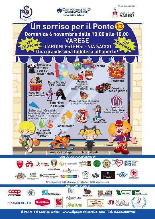 "Un Sorriso per Il Ponte", dopo lo stop per maltempo, arriva il 6 novembre dalle 10.00 alle 18.00 sempre più vicino all'esigenza dei bambini di giocare, giocare e giocare. Giunto alla tredicesima edizione, propone tantissime attrazioni con alcune novità.