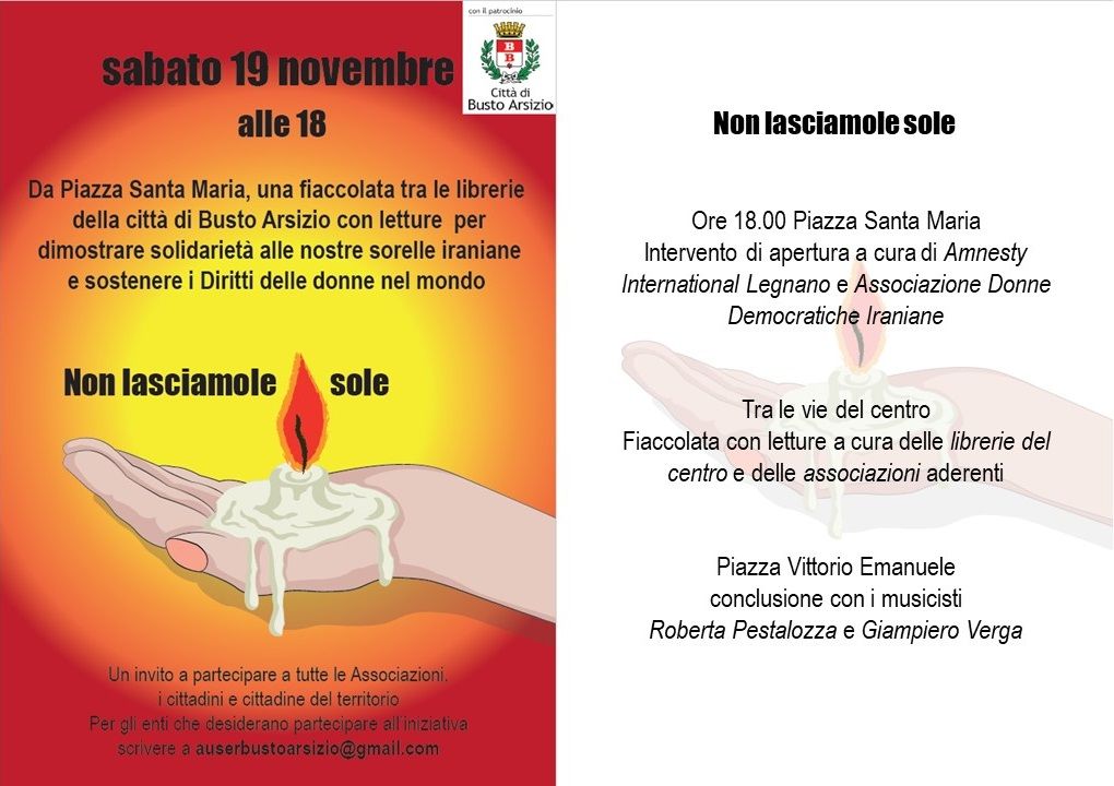 L’iniziativa partirà alle ore 18 di sabato 19 novembre e sarà aperta dall’intervento di “Amnesty International" e dall’“Associazione Donne Democratiche Iraniane”, e si concluderà in piazza Vittorio Emanuele, con un accompagnamento musicale grazie Roberta Pestalozza e Giampaolo Verga, musicisti impegnati in ambito educativo e sociale.
