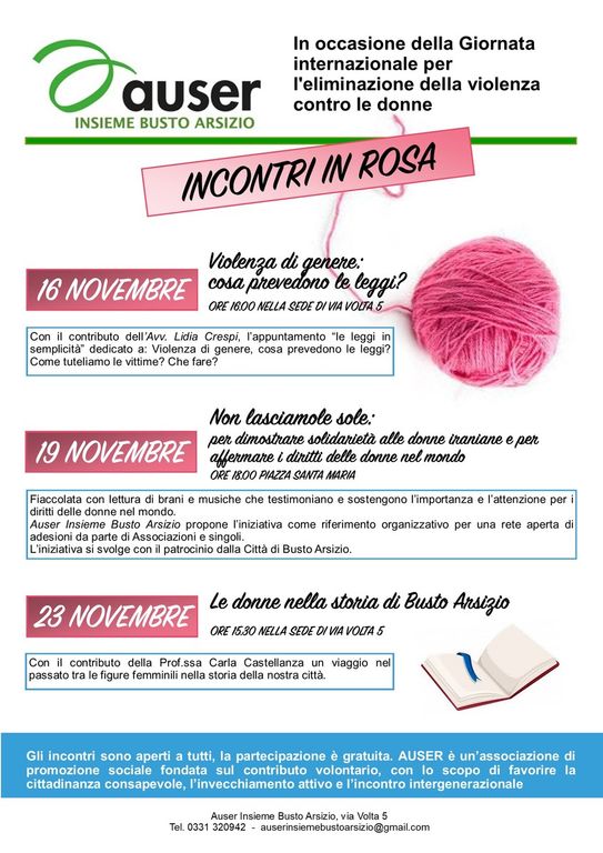 Nella settimana dedicata a contrastare la violenza sulle donne, questa manifestazione si inserisce nel calendario Incontri in Rosa di Auser Insieme Busto Arsizio, una serie di iniziative dedicate ai diritti delle donne e alle donne nella storia di Busto Arsizio.