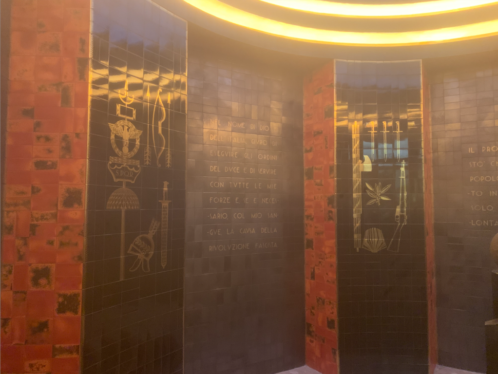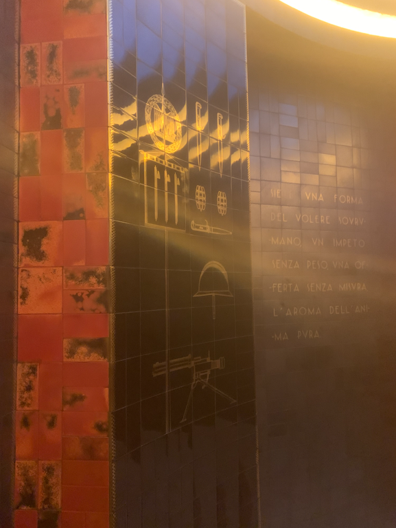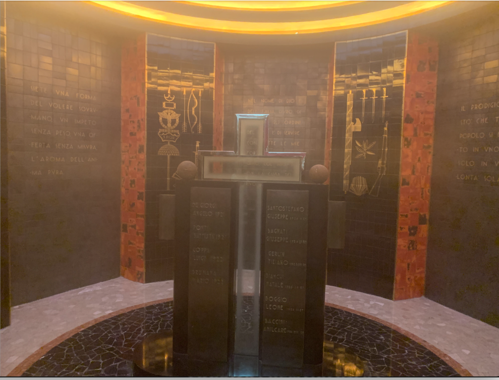 Al piano terreno è collocato il Sacrario, come veniva denominato all'epoca, rimasto immutato nel tempo e unico caso di sacrario fascista conservatosi. L'intera stanza è ricoperta da piastrelle lucide ed opache nere con decori in oro zecchino che sono state realizzate dalla Società Ceramica Italiana di Laveno Mombello su disegno dell'architetto Guido Andlovitz.