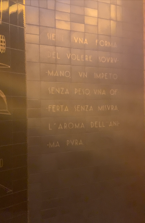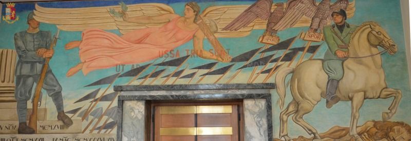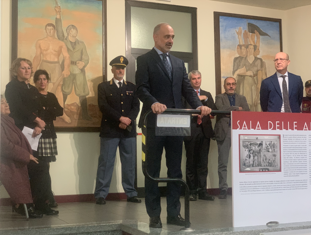 Pieno di sorprese il percorso: dei disegni del progetto dell’edificio ad opera di Mario Loreti (presente questa mattina la nipote Francesca) al sacrario dei martiri fascisti, unico in Italia per stato di conservazione; dagli affreschi di Montanari (all’inaugurazione odierna anche la nipote Daniela) nella sala delle adunanze a quello che raffigura la Vittoria Alata che porge la colora di alloro a un Milite Ignoto, al primo piano all'interno dell’ufficio del questore (la spiegazione completa della mostra in fondo all’articolo).