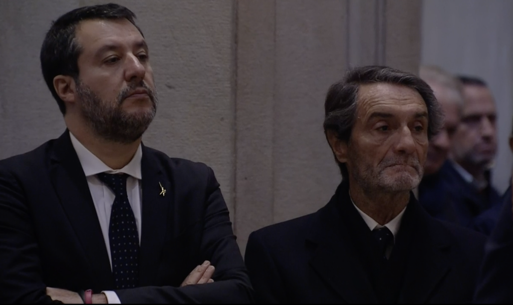Il premier Meloni ha preso posto all'interno della Basilica: insieme a lei anche il prefetto di Varese Salvatore Pasquariello, il sindaco Davide Galimberti, il presidente della Provincia Emanuele Antonelli, il presidente della Regione Lombardia Attilio Fontana e il sindaco di Lozza, paese di origine di Maroni, Giuseppe Licata.