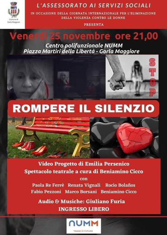 Per l’occasione l’assessorato ai Servizi sociali organizza questa sera alle 21 uno spettacolo teatrale dal titolo “Rompere il silenzio” con Paola Re Ferrè, Renata Vignali, Rocio Bolanos, Fabio Pezzoni, Marco Borsani e Beniamino Cicco. L’audio e le musiche sono curate da Giuliano Furia. L’ingresso è libero.