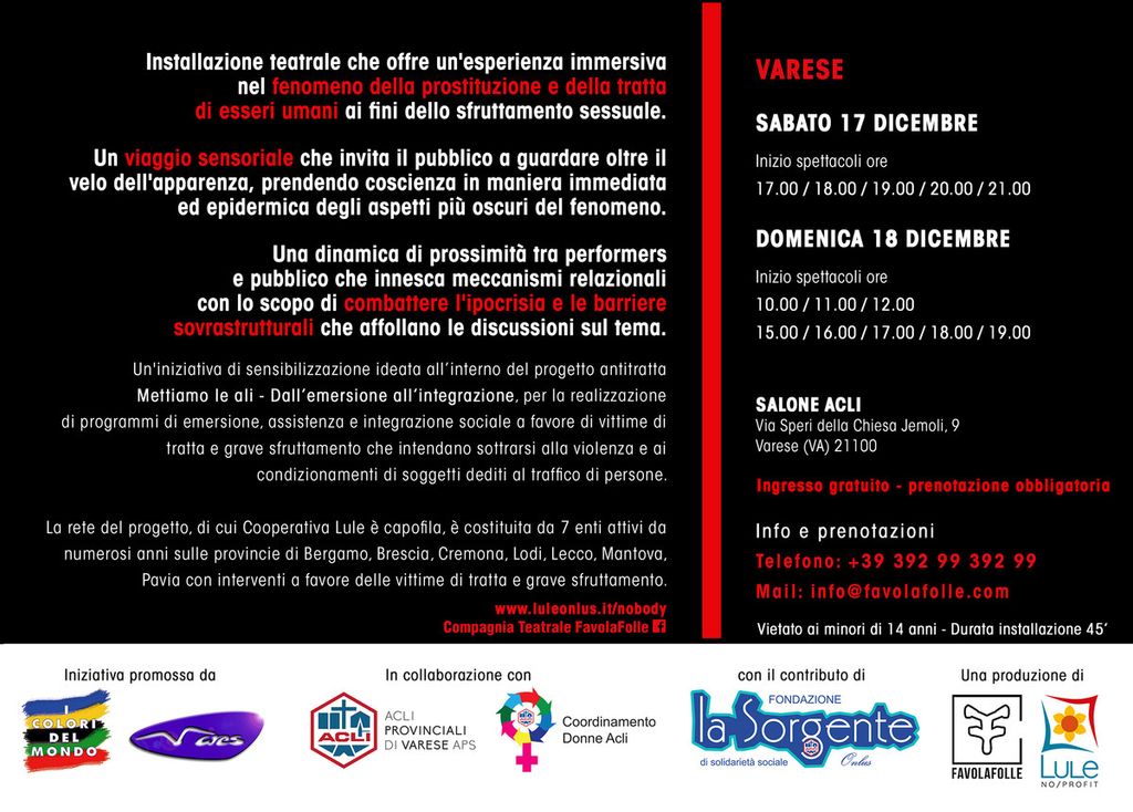 Infine, il terzo evento il 17 e 18 dicembre con una interessante e particolarissima performance teatrale, "No Body", sempre presso le Acli di Varese con ingresso libero ma su prenotazione tramite il link: https://www.eventbrite.it/e/biglietti-nobody-varese-17-18-dicembre-464992504097.