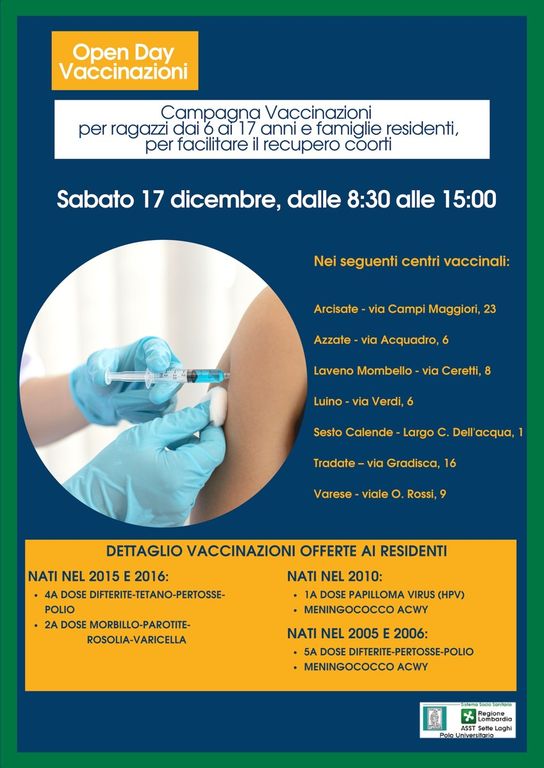 Open day vaccinazioni (con accesso diretto), sabato 17 dicembre, per ragazzi dai 6 ai 17 anni, per facilitare il recupero delle coperture vaccinali obbligatorie.