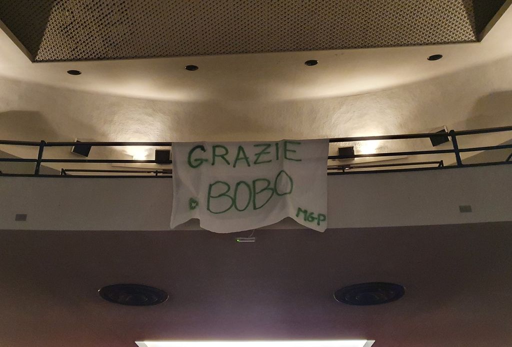 Tanti i manifesti a lui dedicati: dalla balconata del teatro svetta lo striscione con la scritta "Grazie Bobo".